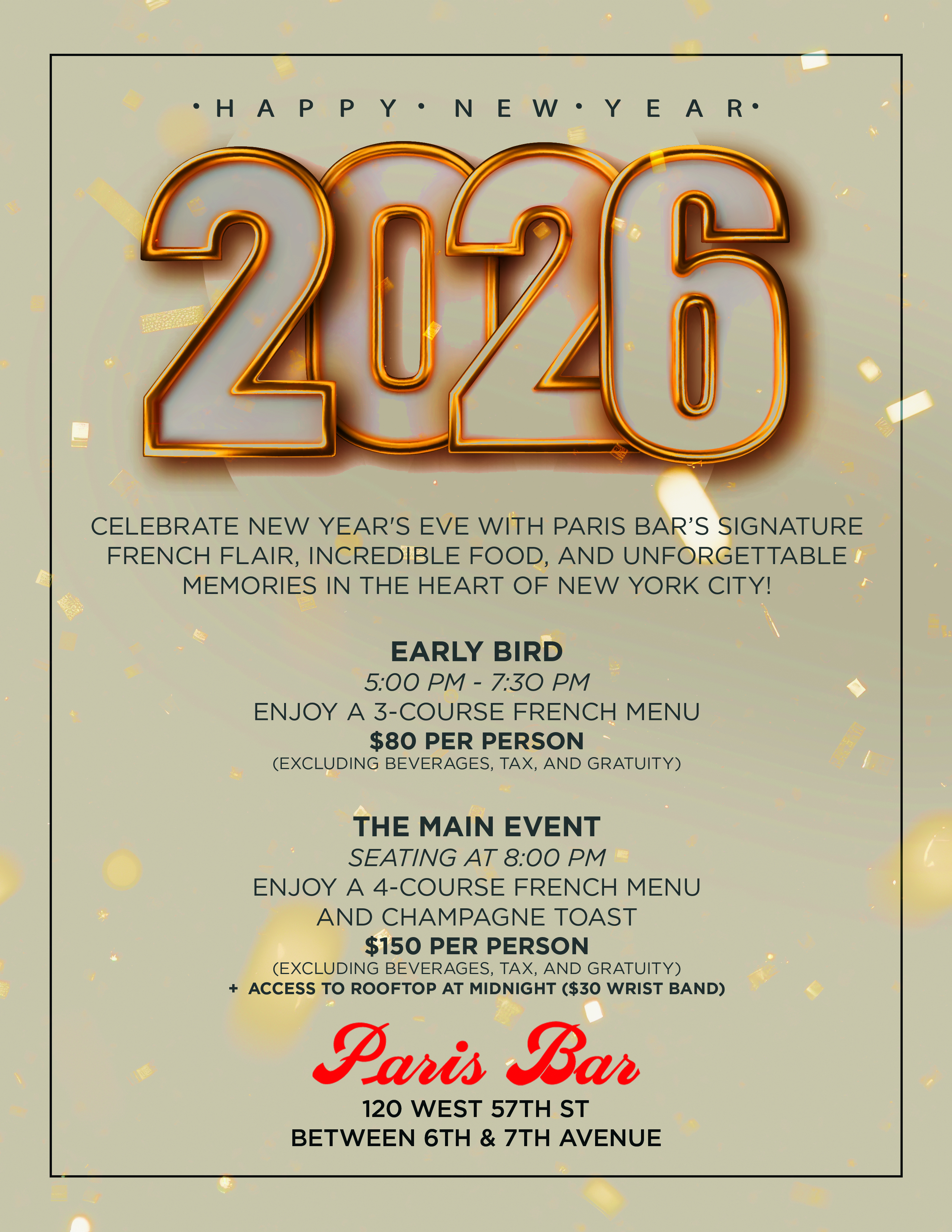 Celebrate New Year's Eve with Paris Bar’s signature French flair, incredible food, and unforgettable memories in the heart of New York City!